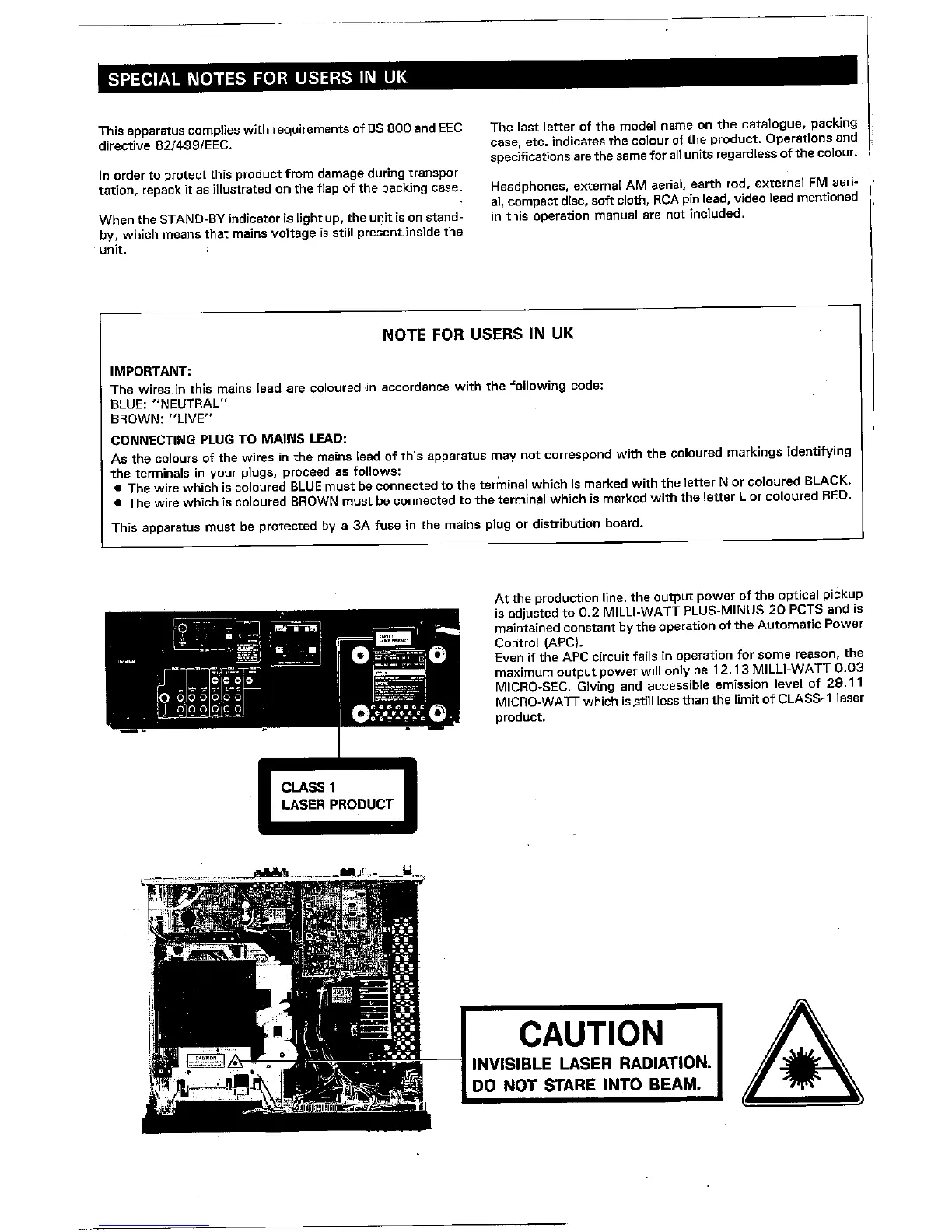 Sharp SA-CD800H - Special Notes; Note for Users in Uk; Connecting Plug to Mains Lead