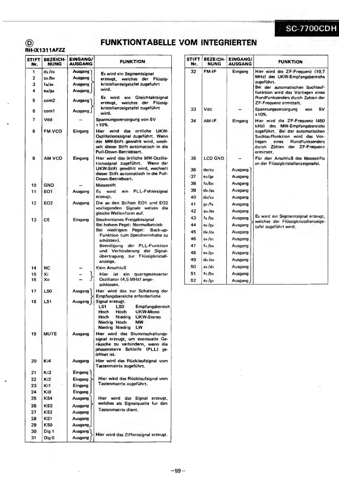 Sharp SC-7700CDH - Funktionstabelle vom Integrierten Schaltkreises