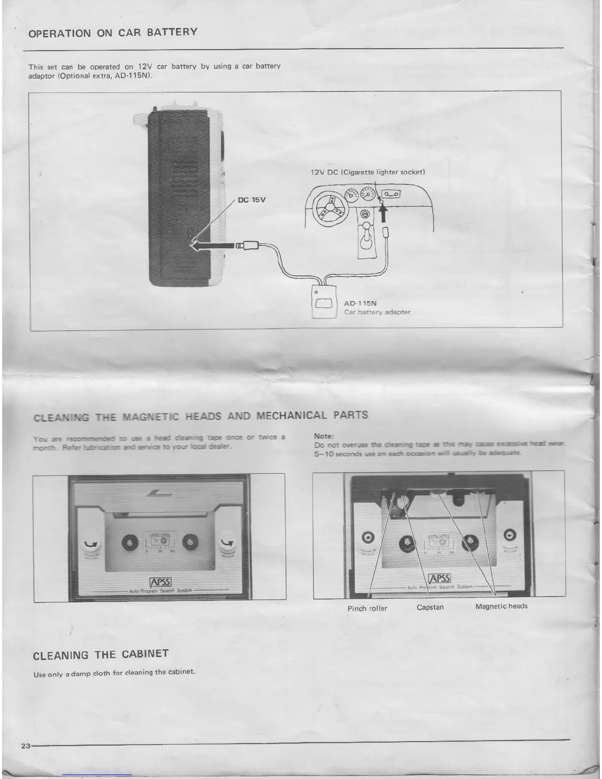 Sharp Searcher GF-9191E - Operation on Car Battery; Cleaning the Magnetic Heads and Mechanical Parts; Cleaning the Cabinet