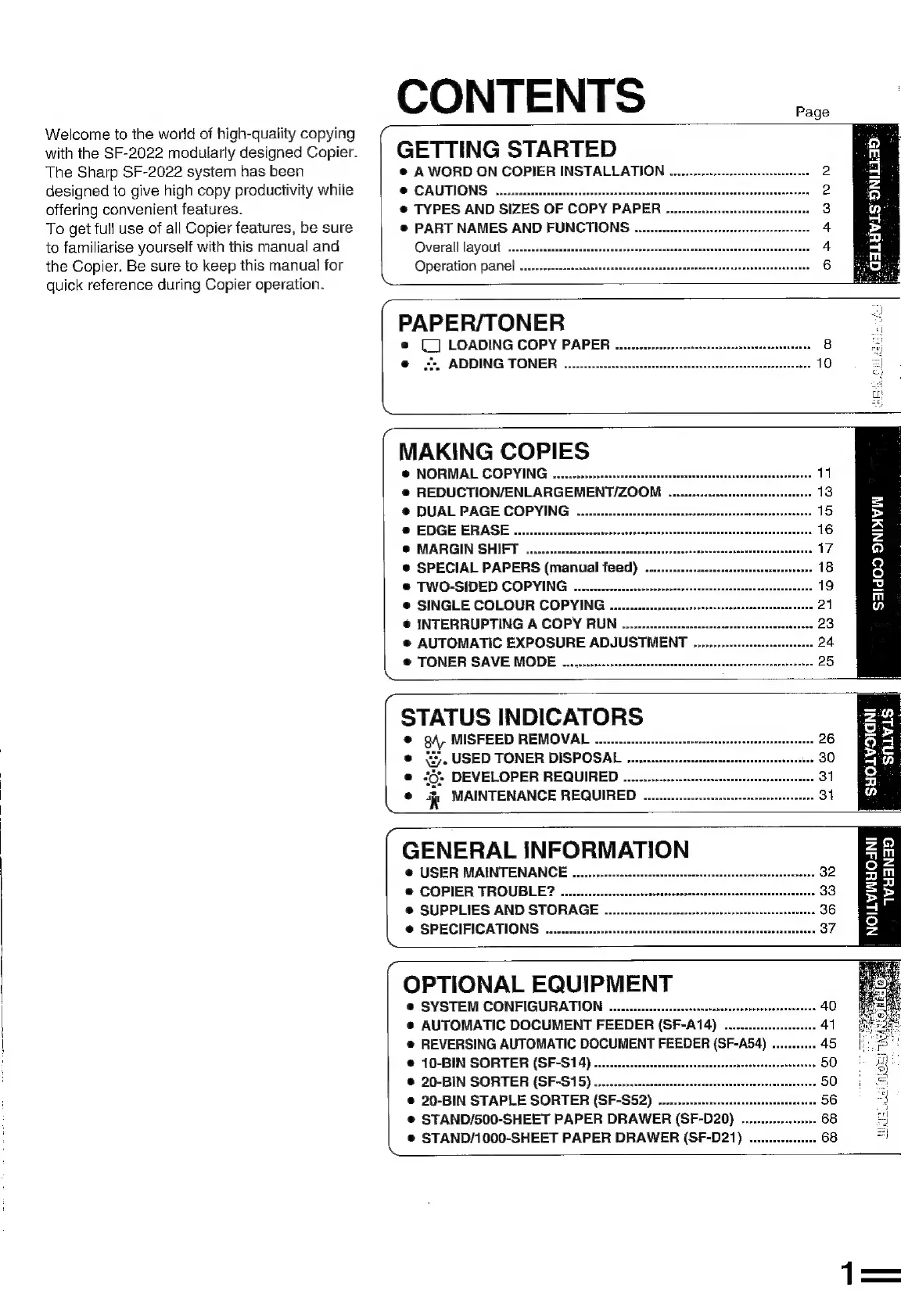 Sharp SF-2022 - Section 1; Table of Contents