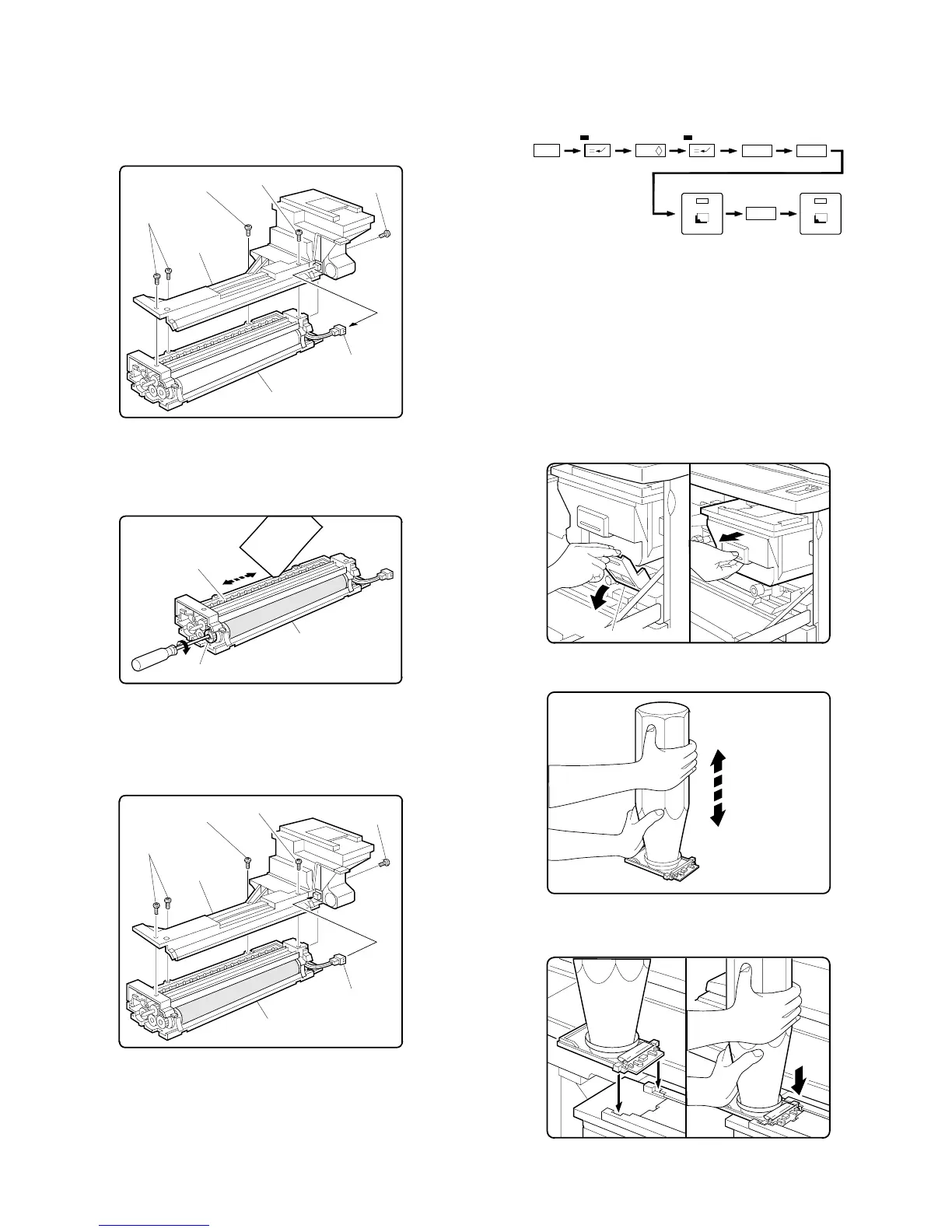 Remove the five toner hopper fixing screws (silver 3 pcs., blue 2