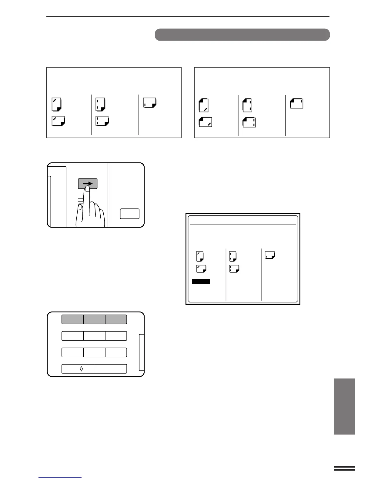Stapling positions on originals in front view Stapling positions on copies on the sort bins