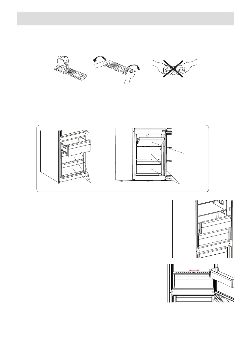 • Zodra het water helemaal is veranderd in ijs kunt u de lade buigen zoals hieronder getoond, om de ijsklontjes