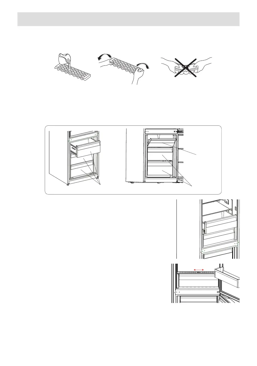 Når vandet er blevet til is, kan De vride bakken som vist herunder, for at få fat i isterningerne.