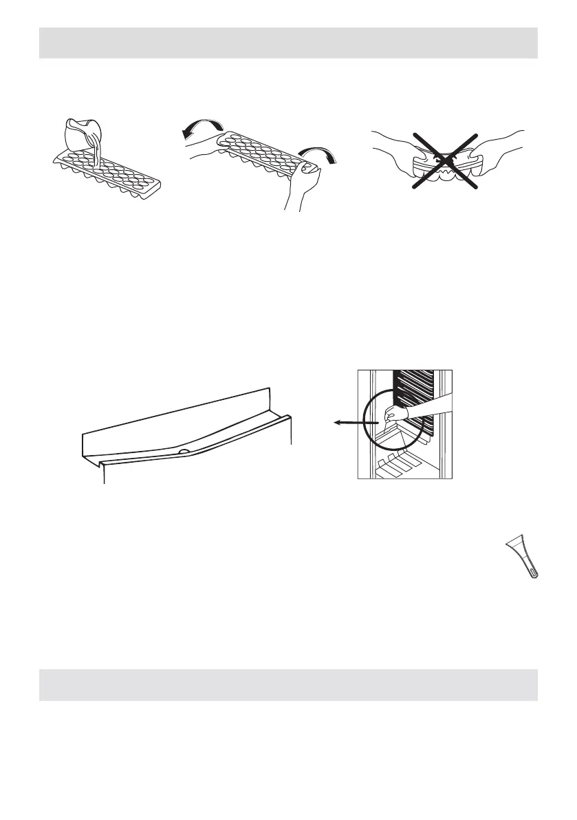• Når vandet er blevet til is, kan De vride bakken som vist herunder, for at få fat i isterningerne.