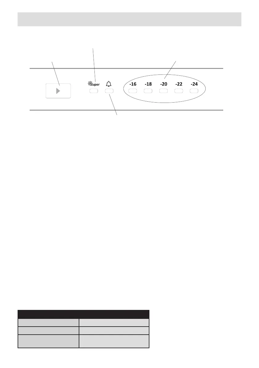 • Bij iedere druk op de knop neemt de temperatuurinstelling af (-16°C, -18°C, -20°C,.. snelvriezen).