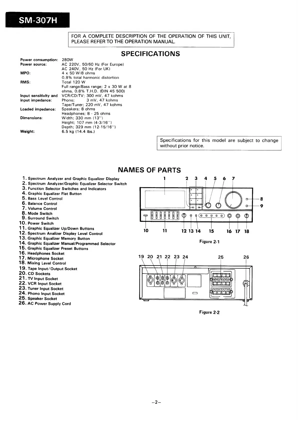 Sharp SM-307H - Specifications; Names of Parts
