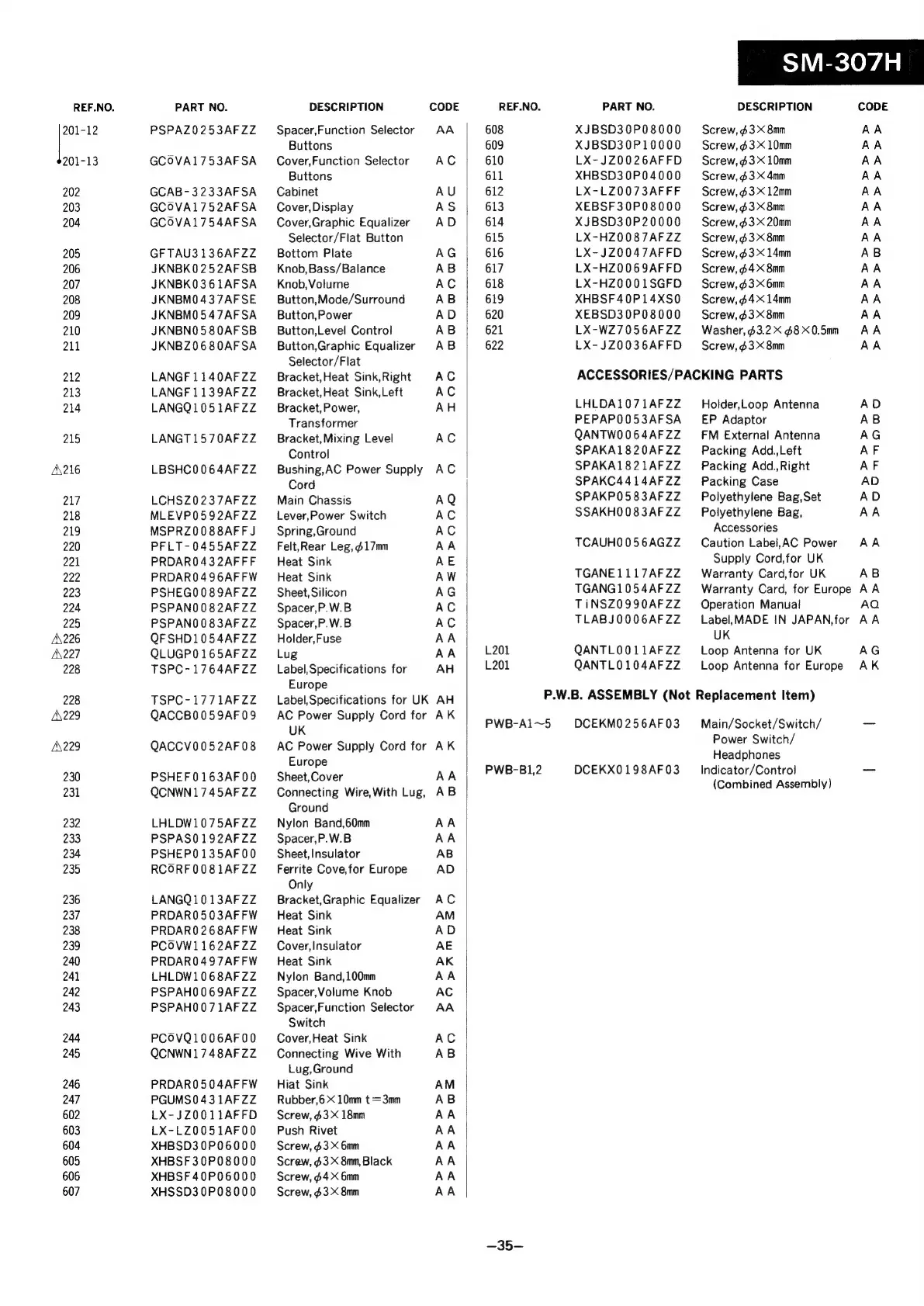 Sharp SM-307H - Replacement Parts List