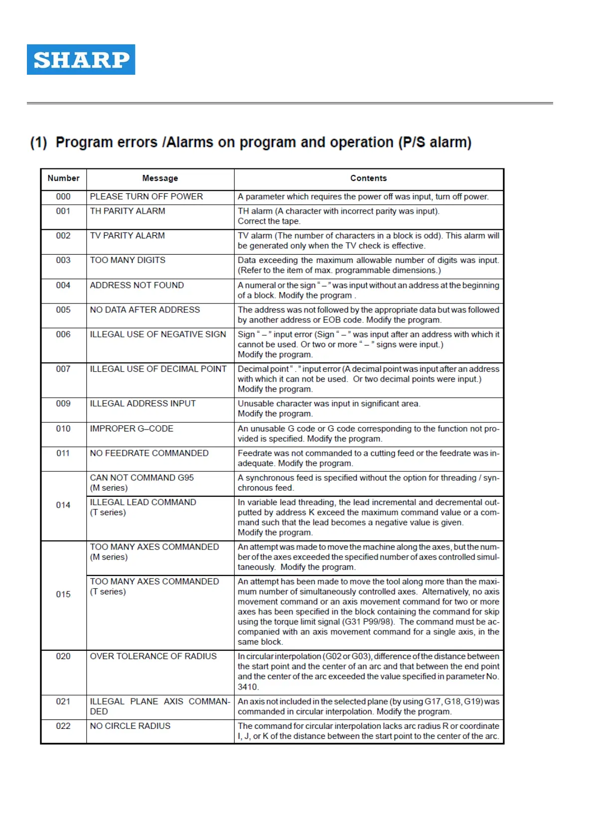 Sharp SV-4328 - 7-4 Program and Servo Alarms Description