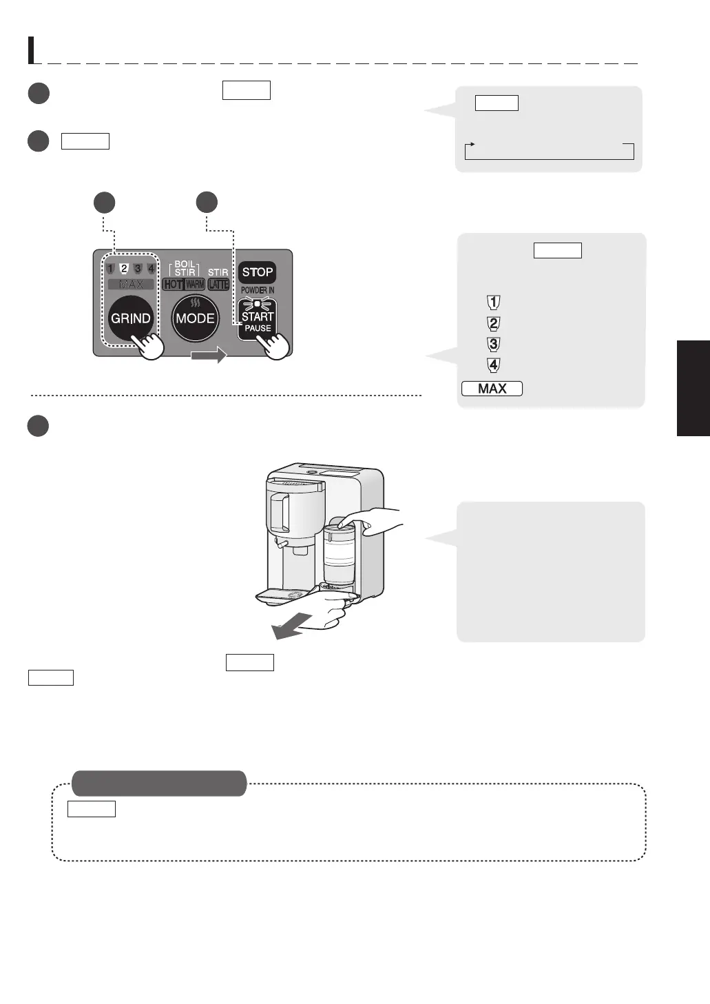 茶葉がお茶うすに残っている場合は、GRINDを1度押し、