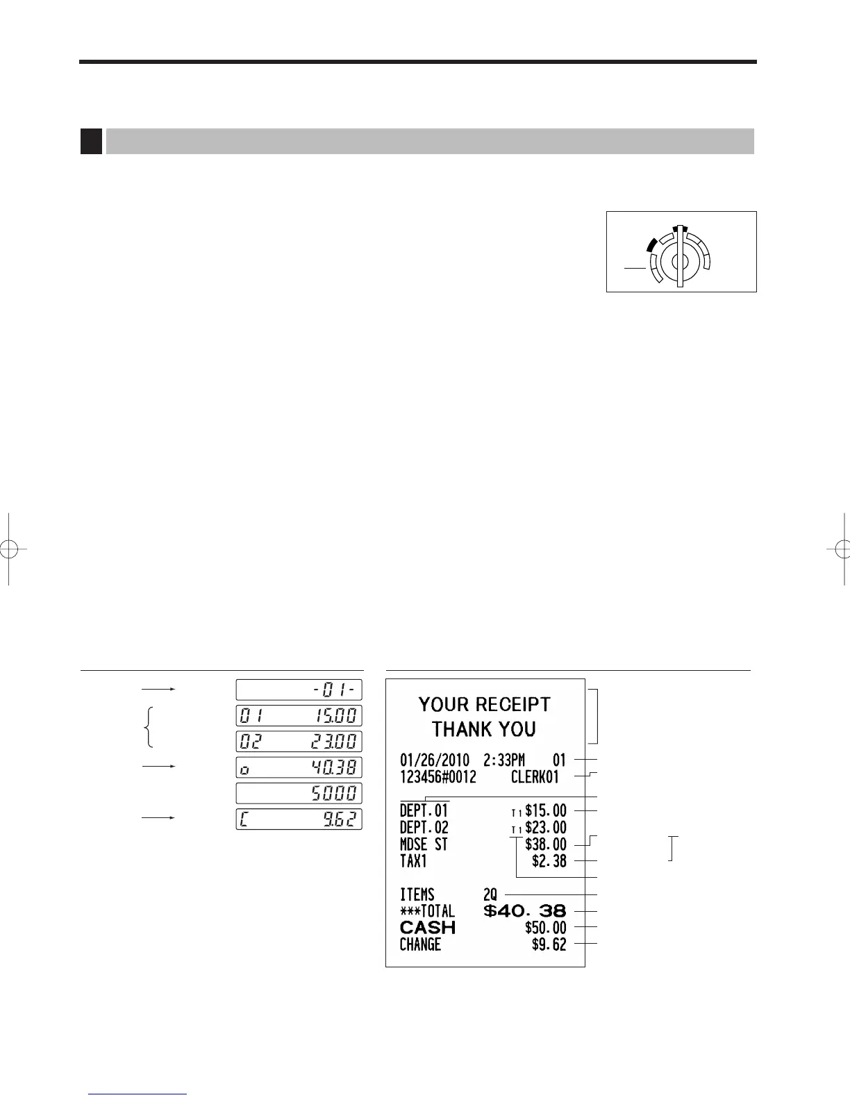 Listed below is a basic sales entry example when selling department items by cash. For operation details,