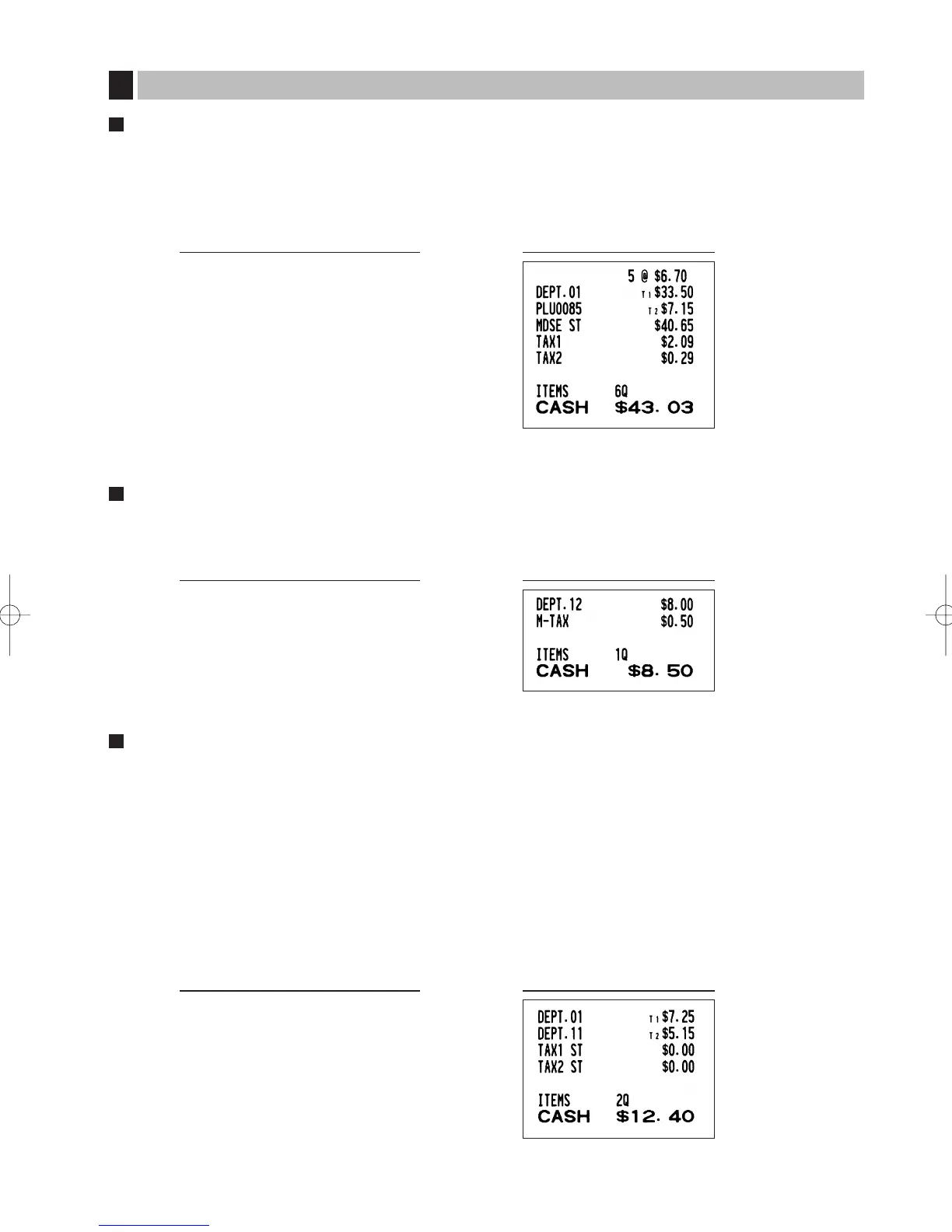 Example: Selling five $6.70 items (dept. 1, taxable 1) and one $7.15 item (PLU 85, taxable 2) for cash