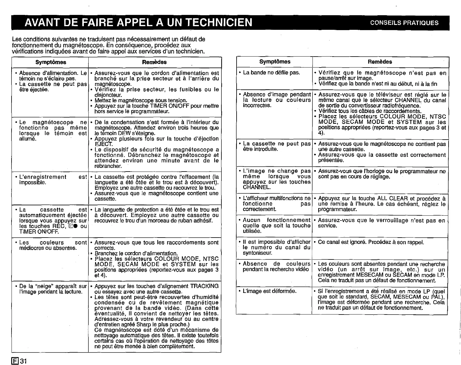 AVANT DE FAIRE APPEL A UN TECHNICIEN