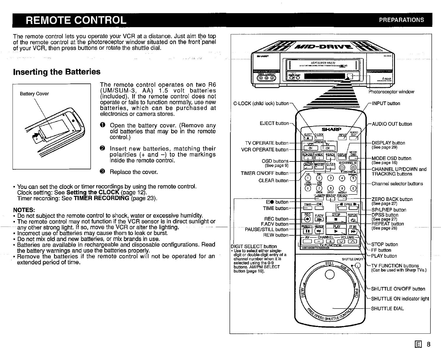 • The remote control may not function if the VCR sensor is in direct sunlight or