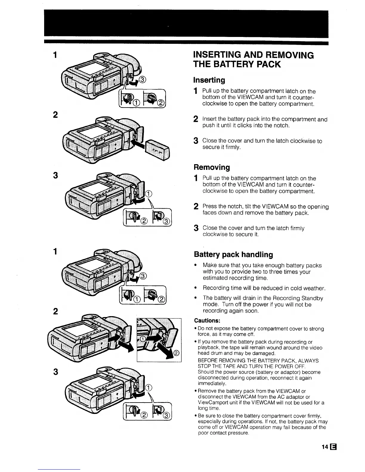 Sharp ViewaCam VL-H29E - Inserting and Removing the Battery Pack; Battery Pack Handling