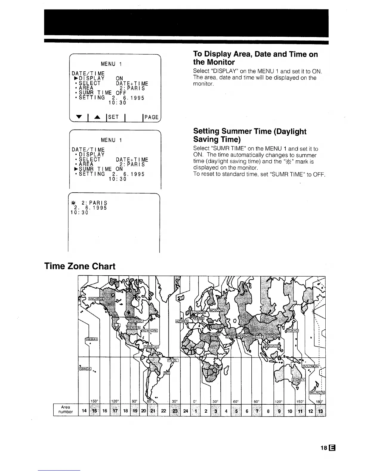 Sharp ViewaCam VL-H29E - To Display Area, Date and Time on the Monitor; Setting Summer Time; Daylight Saving Time; Time Zone Chart