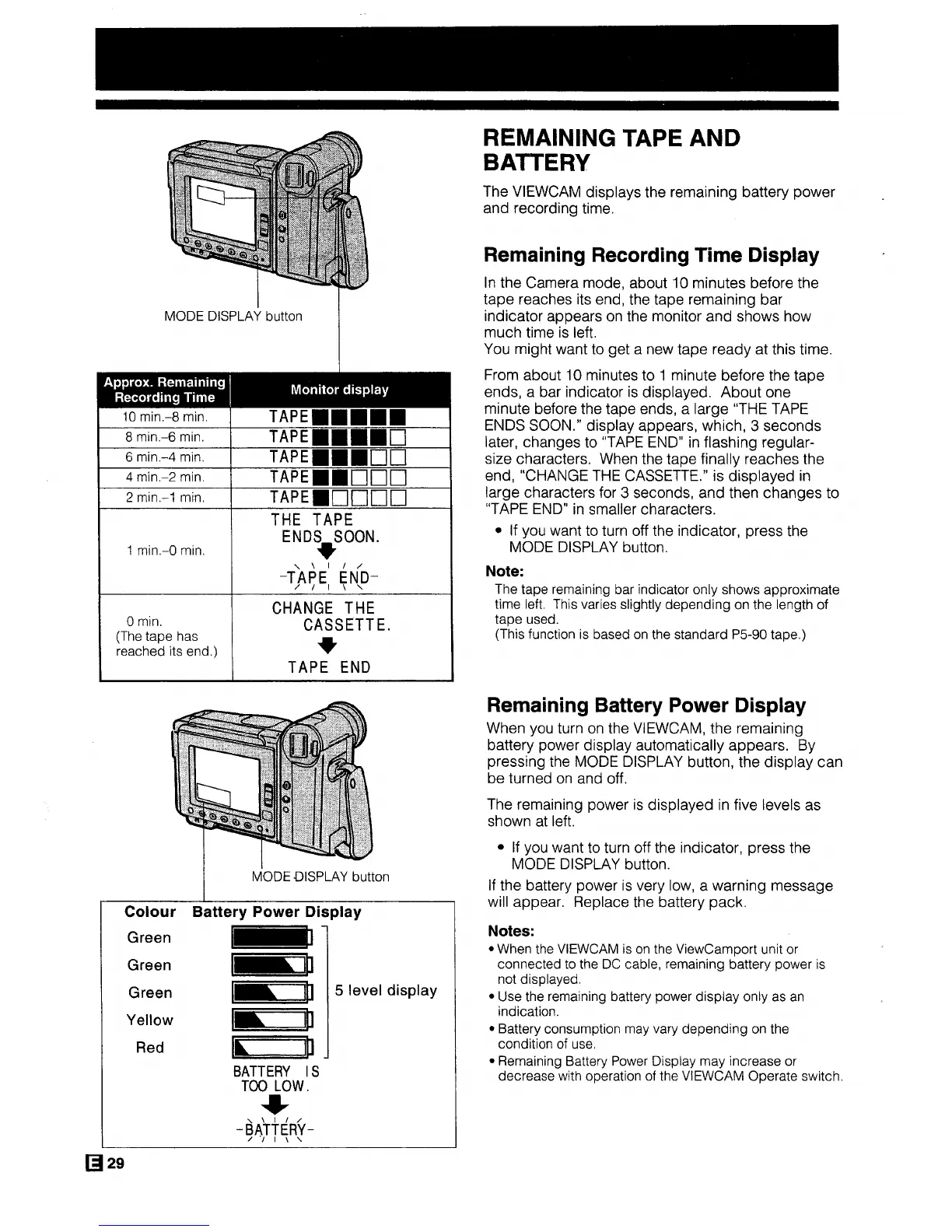 Sharp ViewaCam VL-H29E - Remaining Tape and Battery; Remaining Recording Time Display; Remaining Battery Power Display