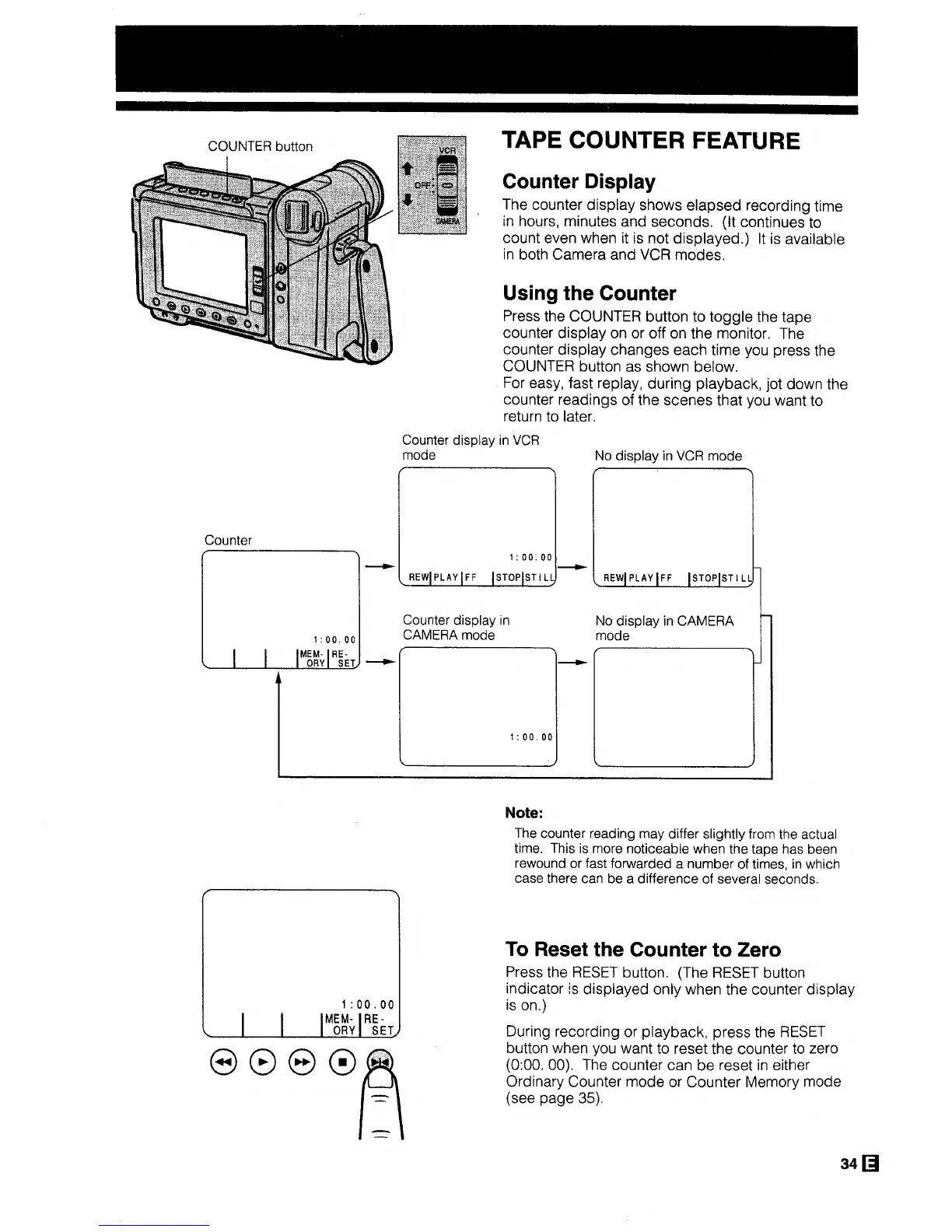 Sharp ViewaCam VL-H29E - Tape Counter Feature; Counter Display; Using the Counter; To Reset the Counter to Zero