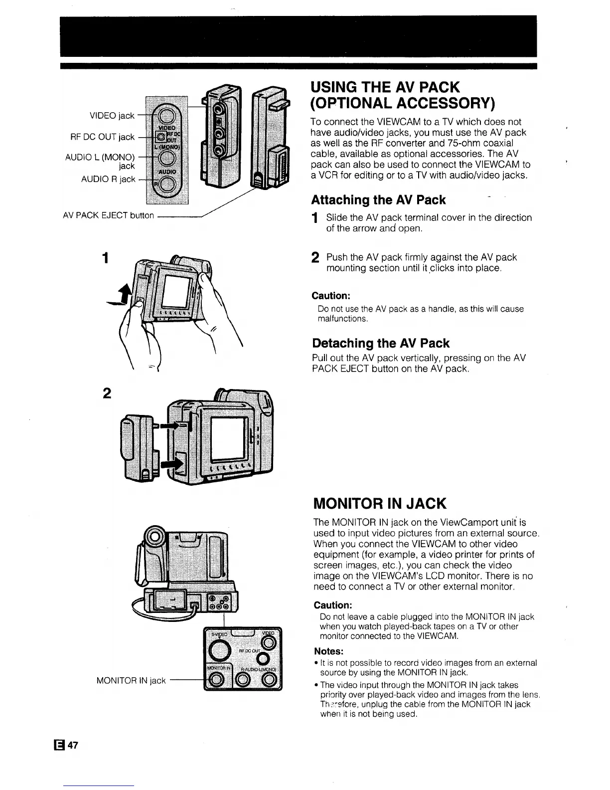 Sharp ViewaCam VL-H29E - Using the AV Pack; Optional Accessory; Attaching the AV Pack; Monitor in Jack