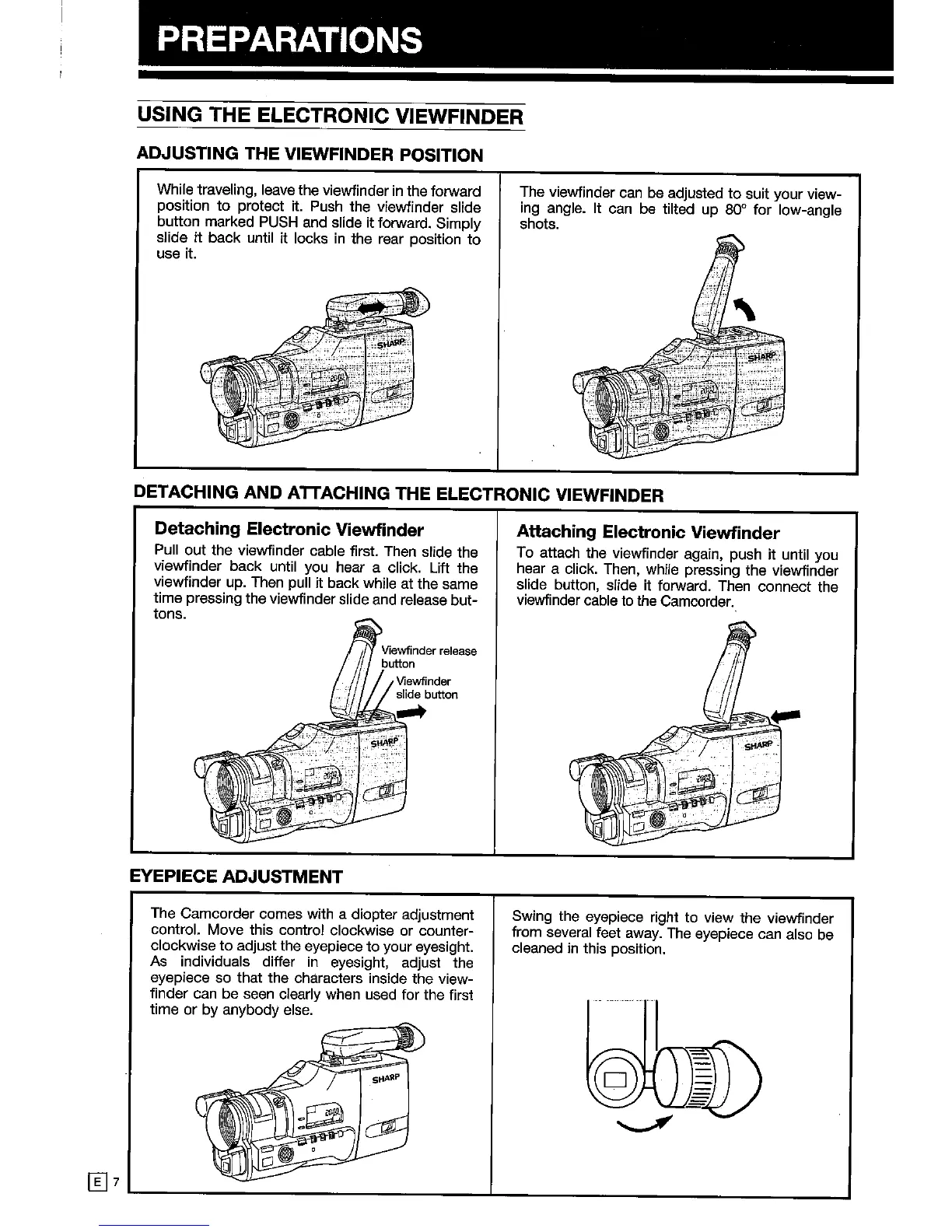 Sharp VL-C650S - Preparations; Using the Electronic Viewfinder; Adjusting the Viewfinder Position; Detaching and Attaching the Electronic Viewfinder