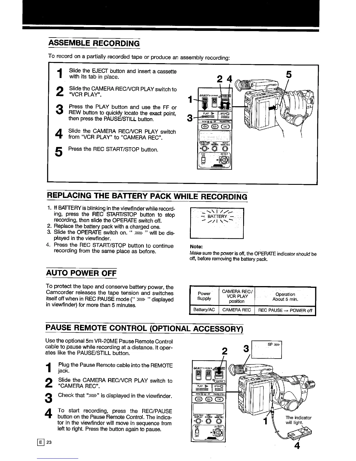 Sharp VL-C650S - Assemble Recording; Replacing the Battery Pack While Recording; Auto Power off; Pause Remote Control