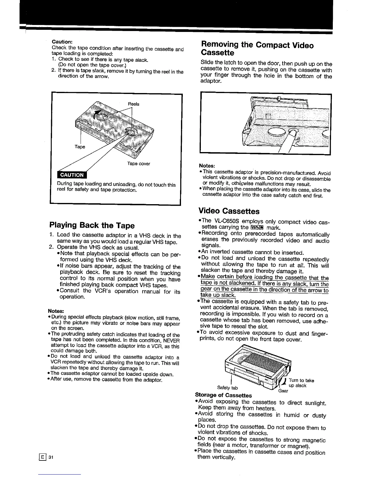 Sharp VL-C650S - Removing the Compact Video Cassette; Video Cassettes; Playing Back the Tape; Storage of Cassettes