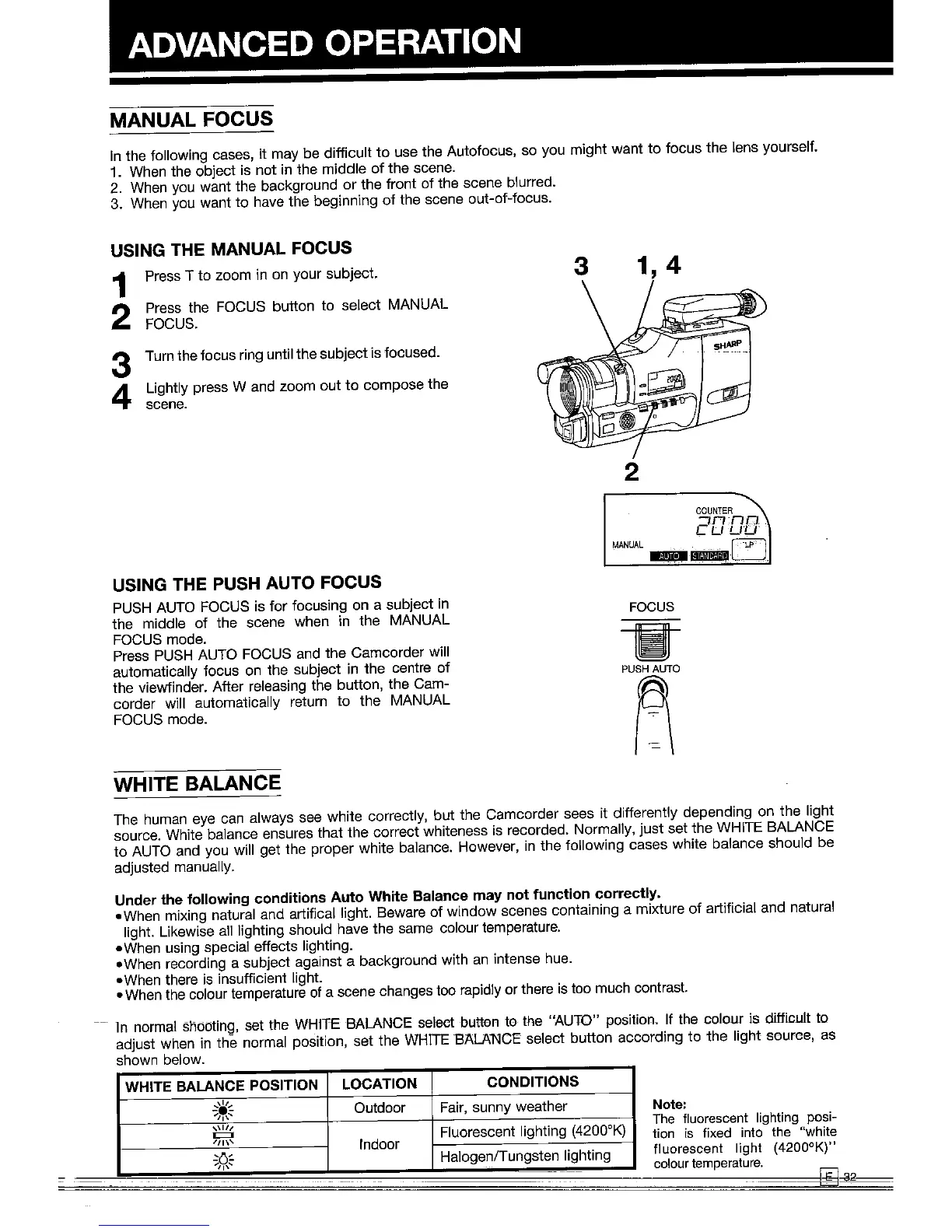 Sharp VL-C650S - Advanced Operation; Manual Focus; Using the Manual Focus; Using the Push Auto Focus