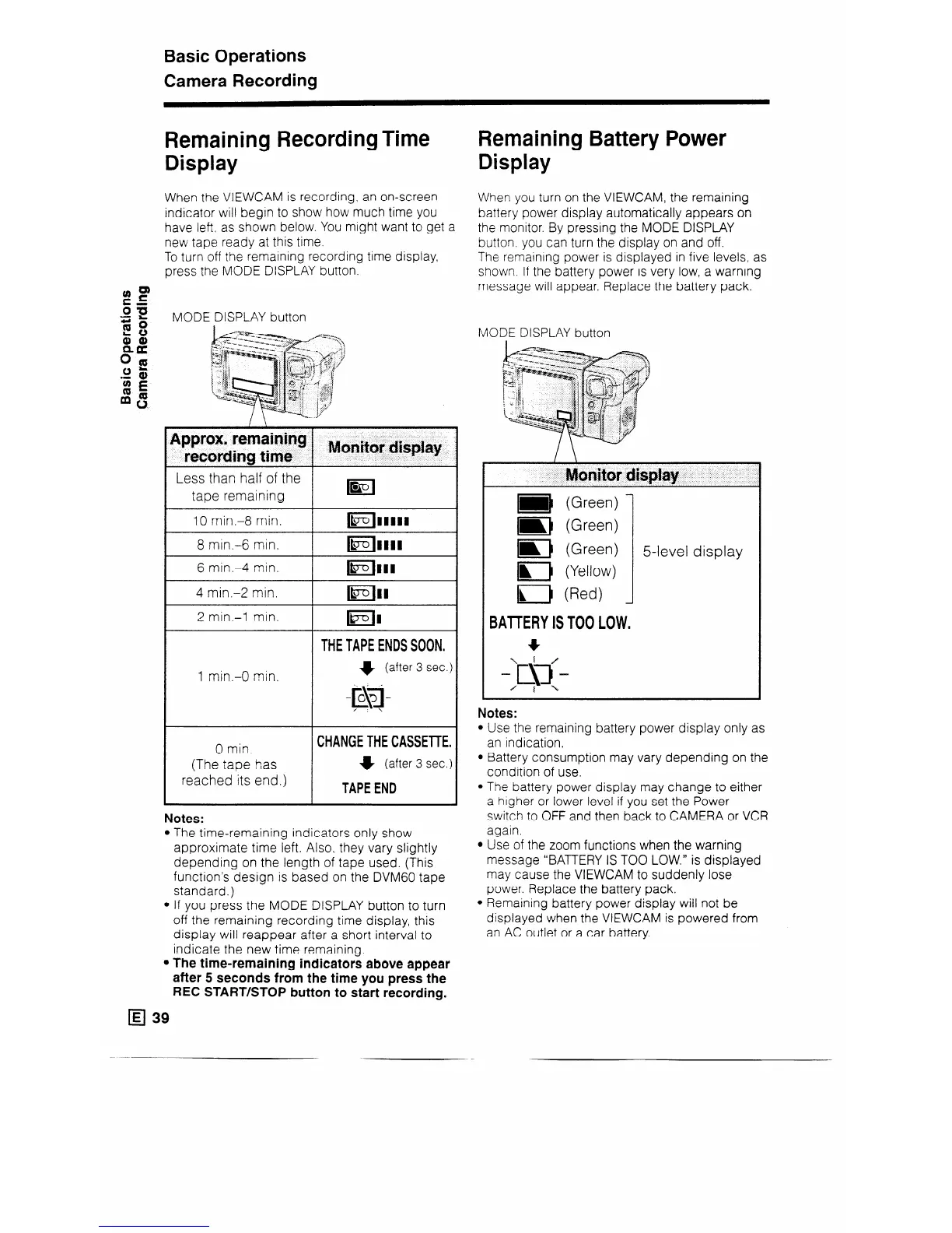 When you turn on the VIEWCAM, the remaining