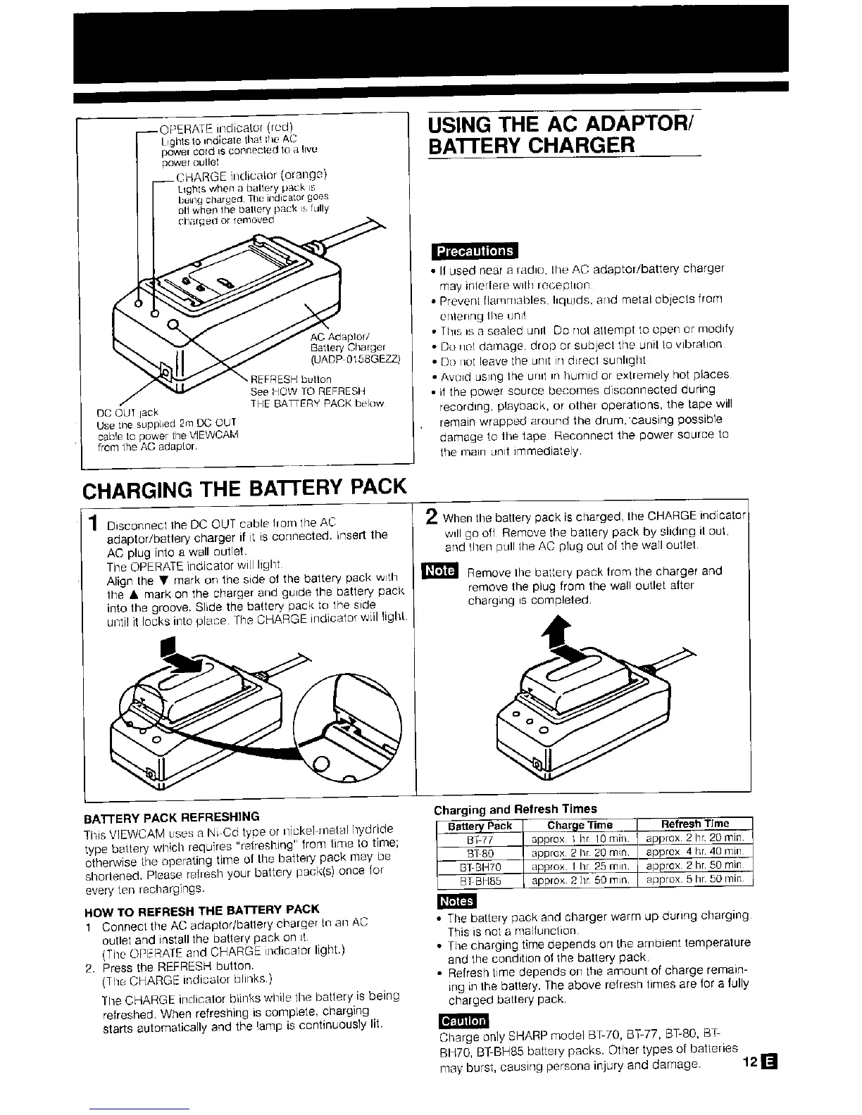 Sharp VL-H400S - Using the AC Adaptor;Battery Charger; Charging the Battery Pack; Battery Pack Refreshing; How to Refresh the Battery Pack