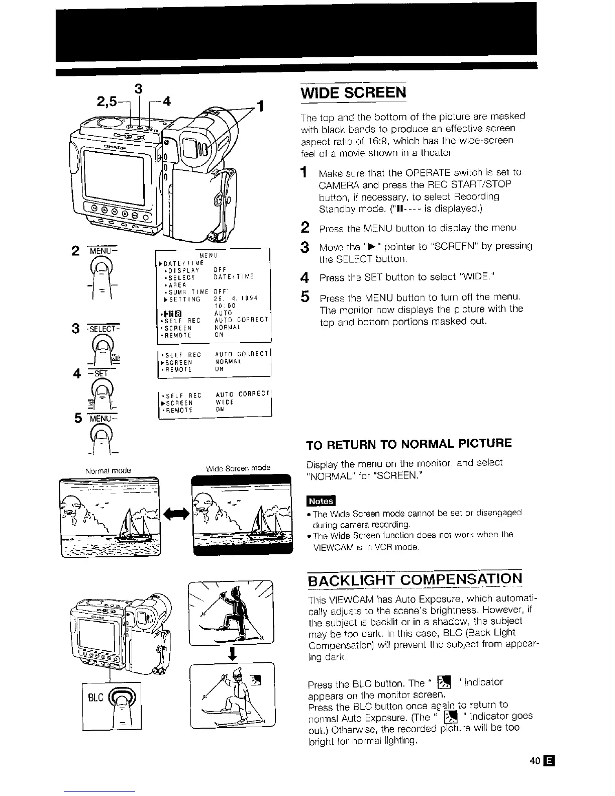 Sharp VL-H400S - Wide Screen; Backlight Compensation; To Return to Normal Picture
