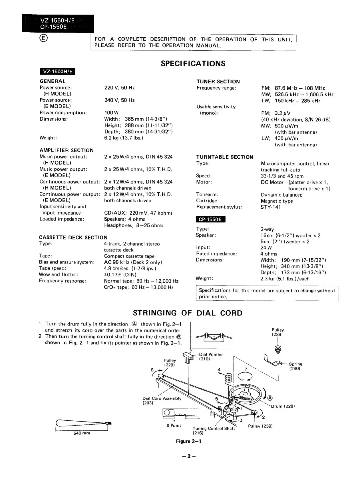 Sharp VZ-1550H(BK) - Specifications; General Specifications; Amplifier Section Specifications; Cassette Deck Section Specifications