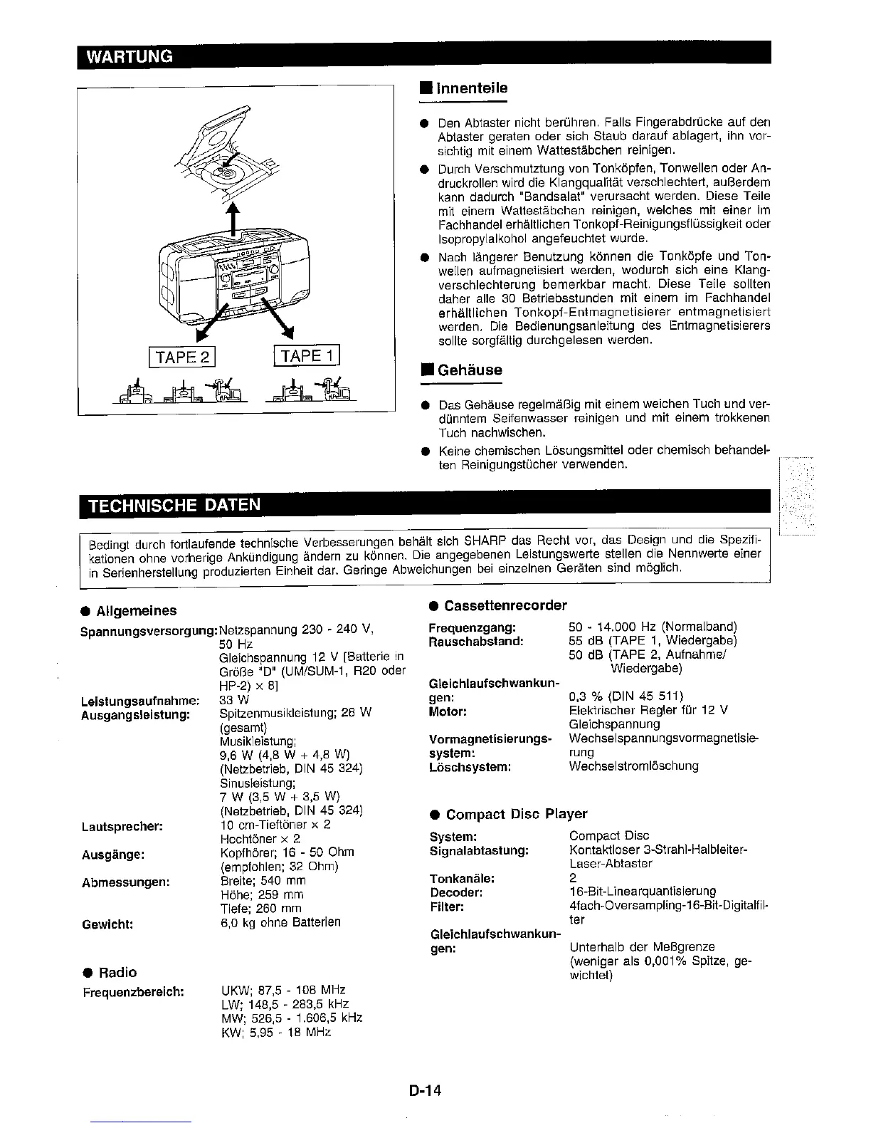 Sharp WQ-CH800H - Maintenance and Specifications; Internal Component Maintenance; External Cabinet Care; Technical Specifications Overview