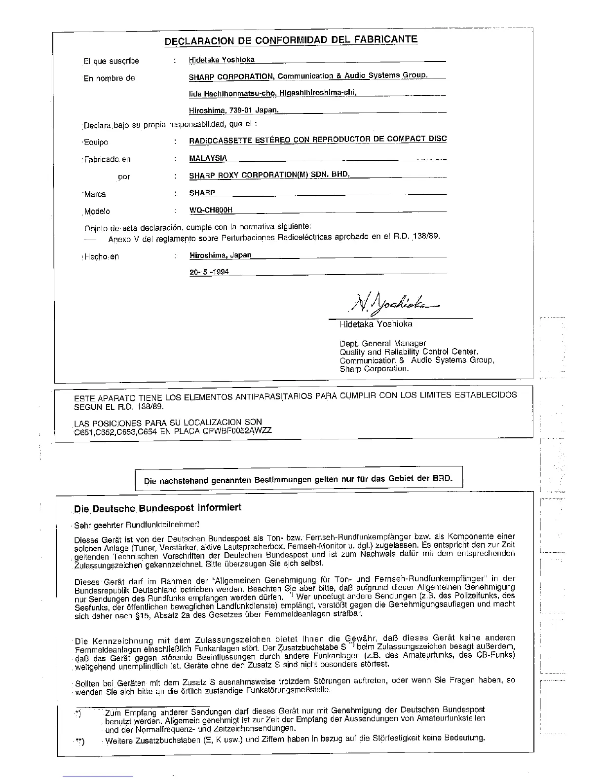 Sharp WQ-CH800H - Manufacturers Declaration of Conformity; Product Compliance Statement