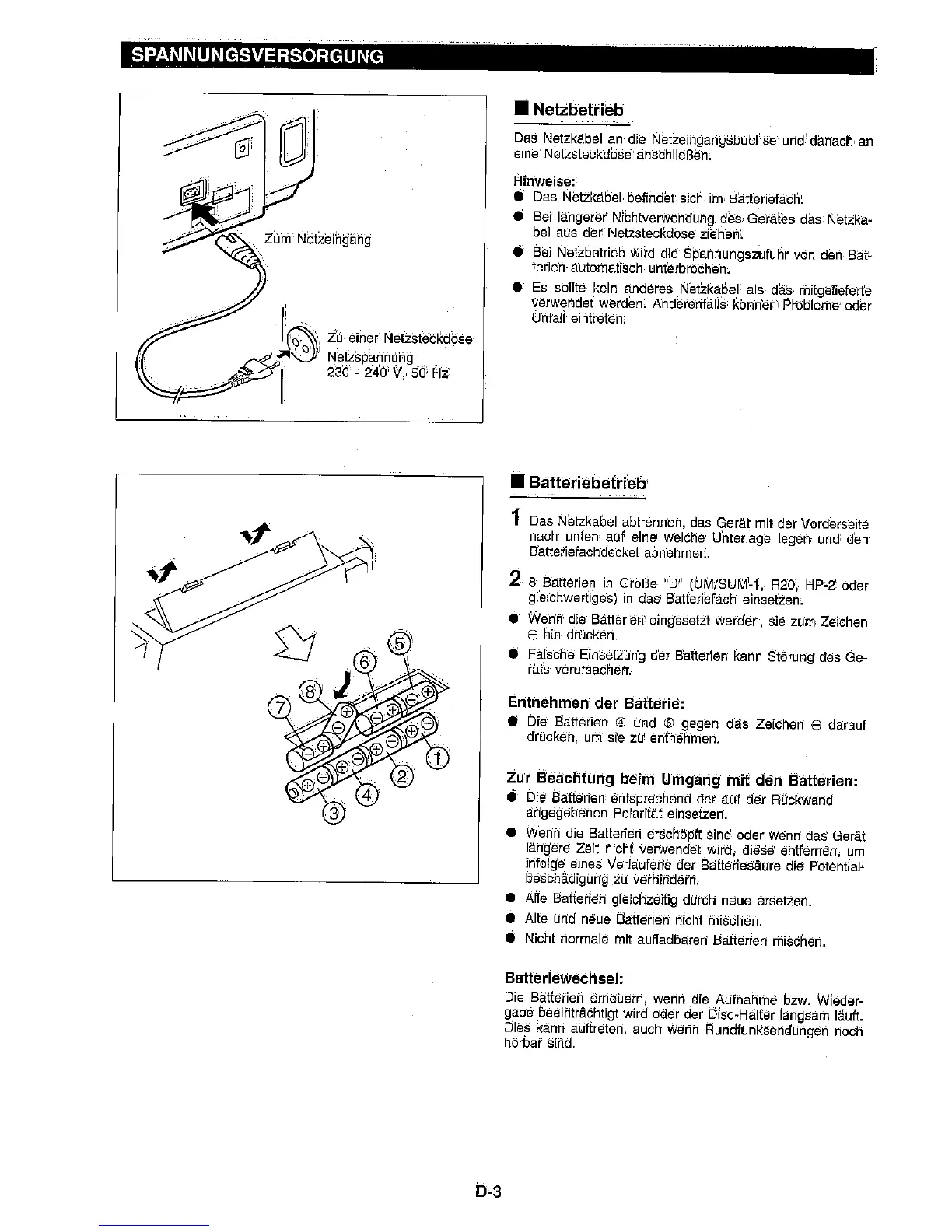 Sharp WQ-CH800H - Power Source Options; AC Power Connection; Battery Power Installation and Removal; Battery Usage Precautions
