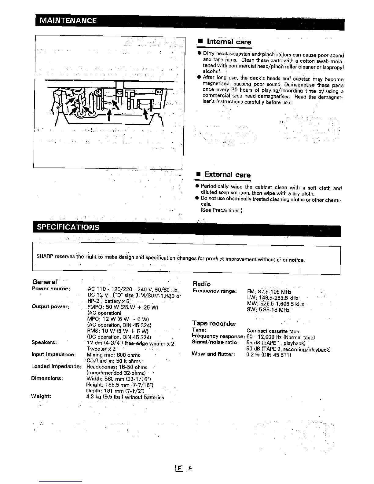 Sharp WQ-T360H - Maintenance; Internal Care; Specifications