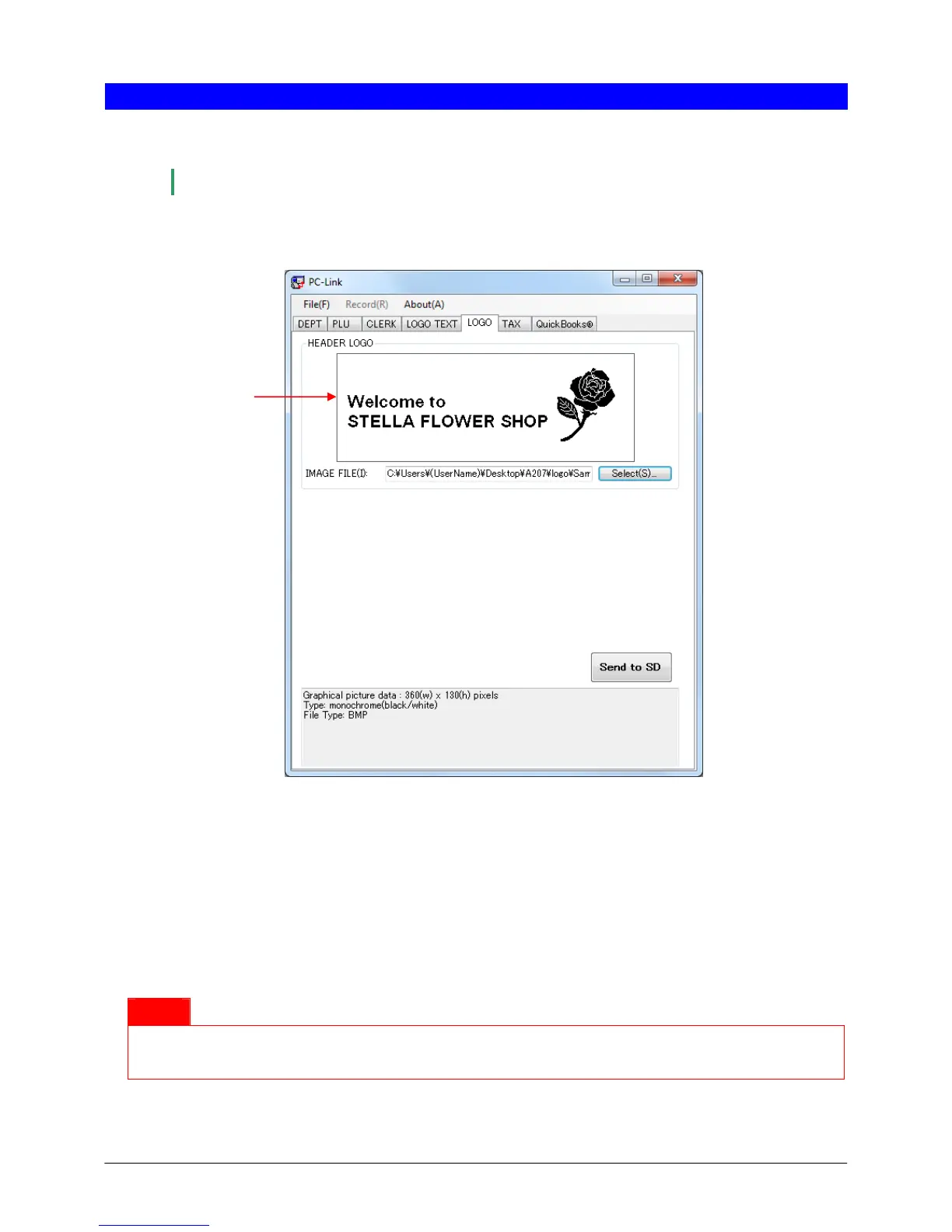 You can set header logo data (a graphic logo printed on the receipt) in the cash register. To open the LOGO screen,