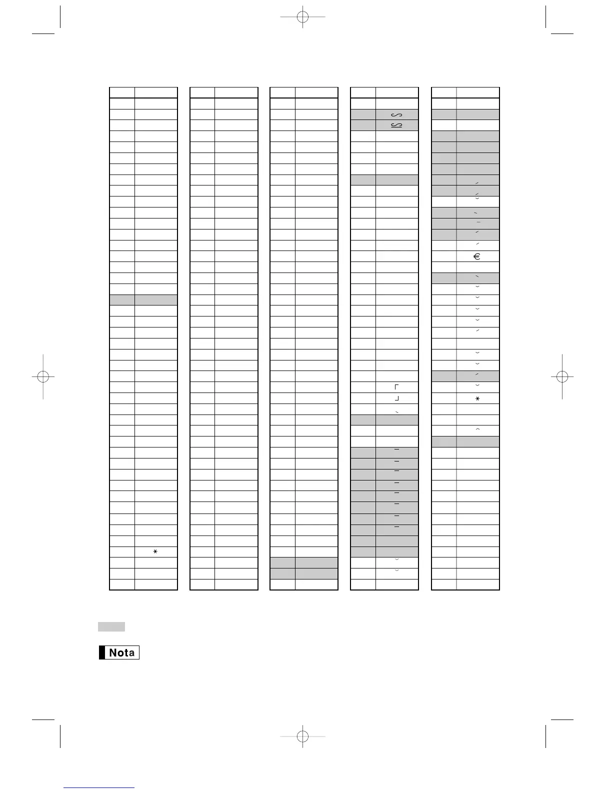 Table des codes de caractères alphanumériques