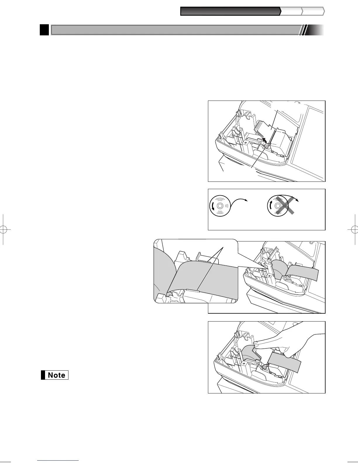 Install the paper roll according to the procedure shown below with the AC cord connected and the mode switch