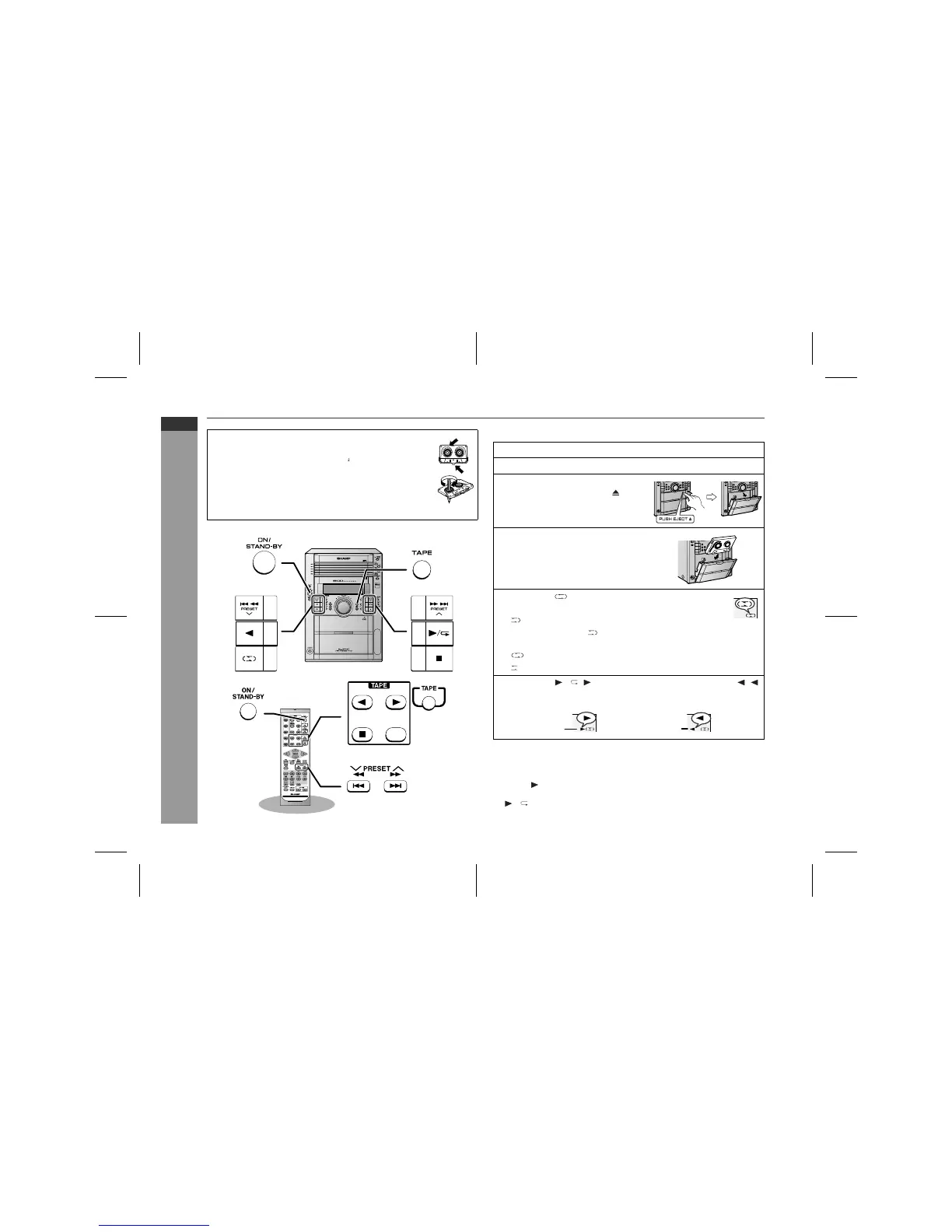 TAPE button (main unit and remote control): The unit turns on