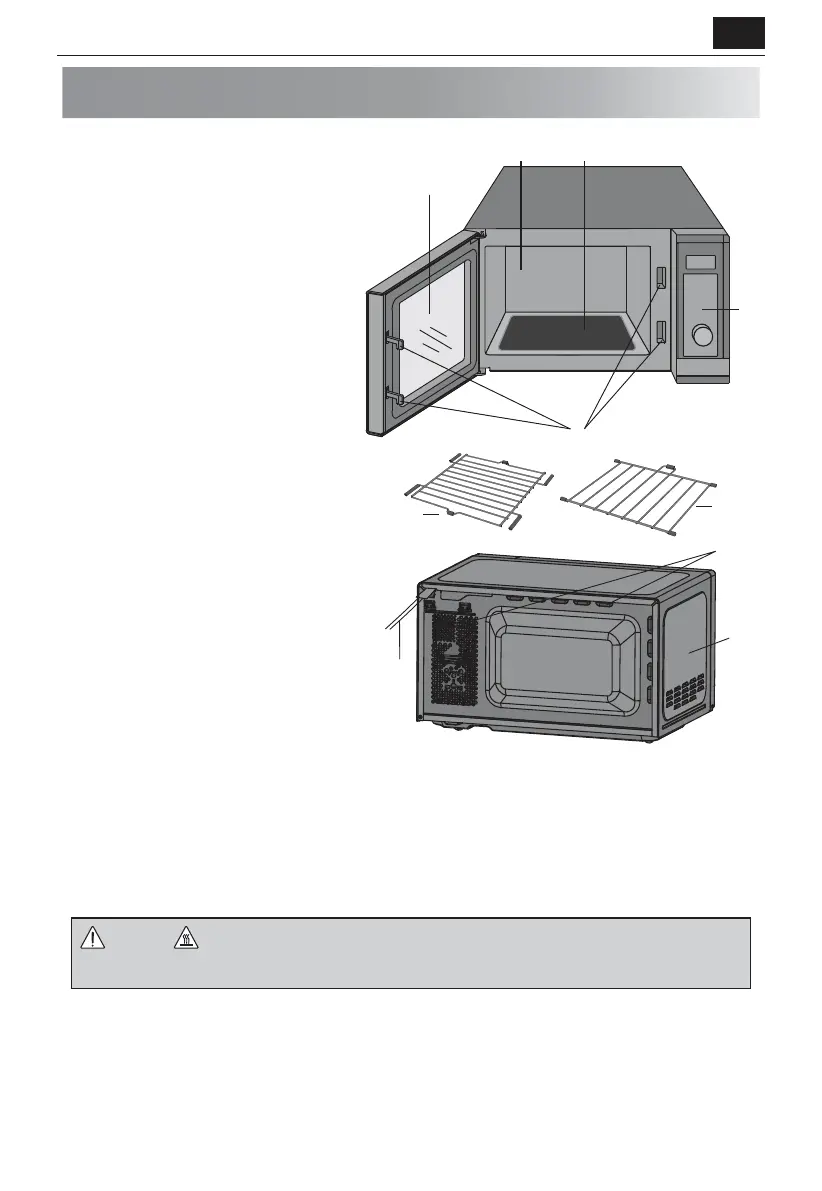 können. Die Tür, das Gehäuse, der Garraum, Zubehör und Geschirr werden beim Betrieb sehr heiß.