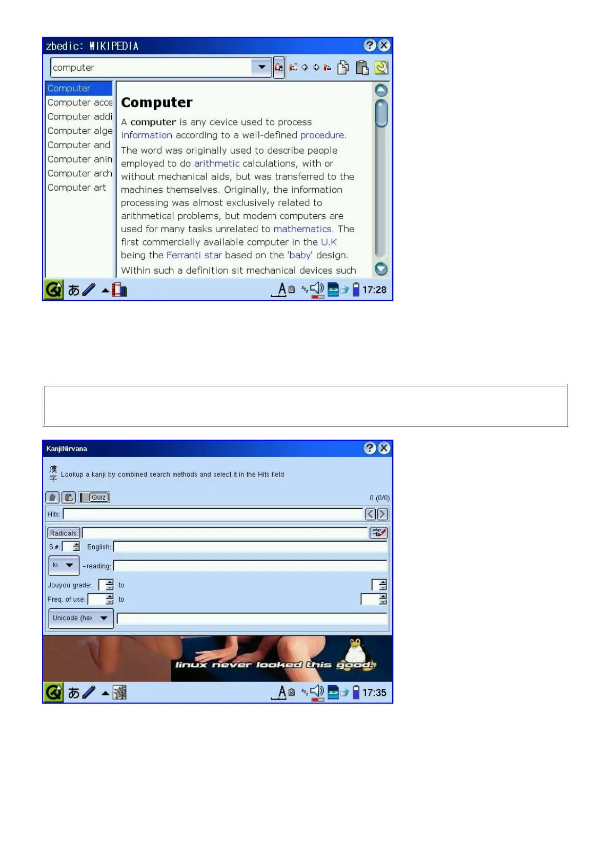 KanjiNirvana [kani_1.2.0_arm.ipk] is a kanji dictionary and practice tool. The following needs to