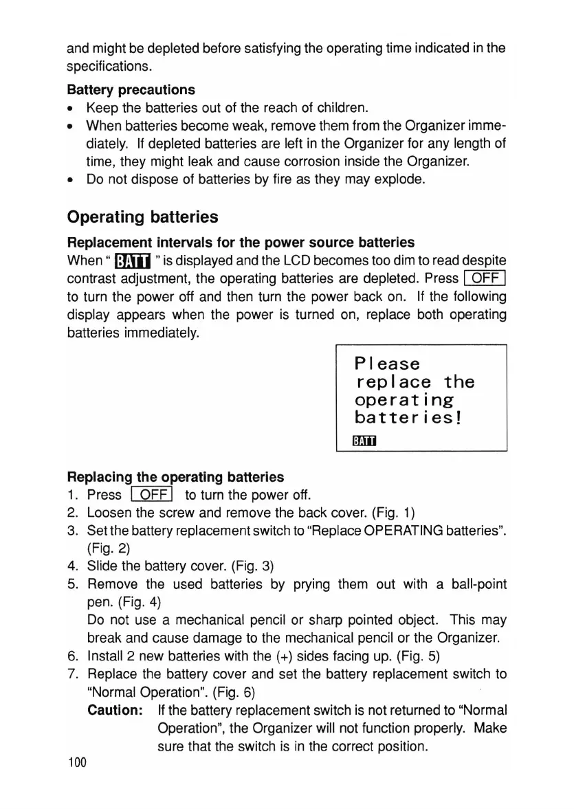 diately. If depleted batteries are left in the Organizer for any length of