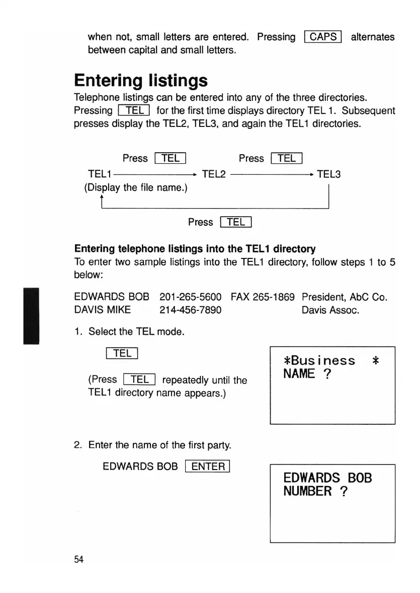 To enter two sample listings into the TEL1 directory, follow steps 1 to 5
