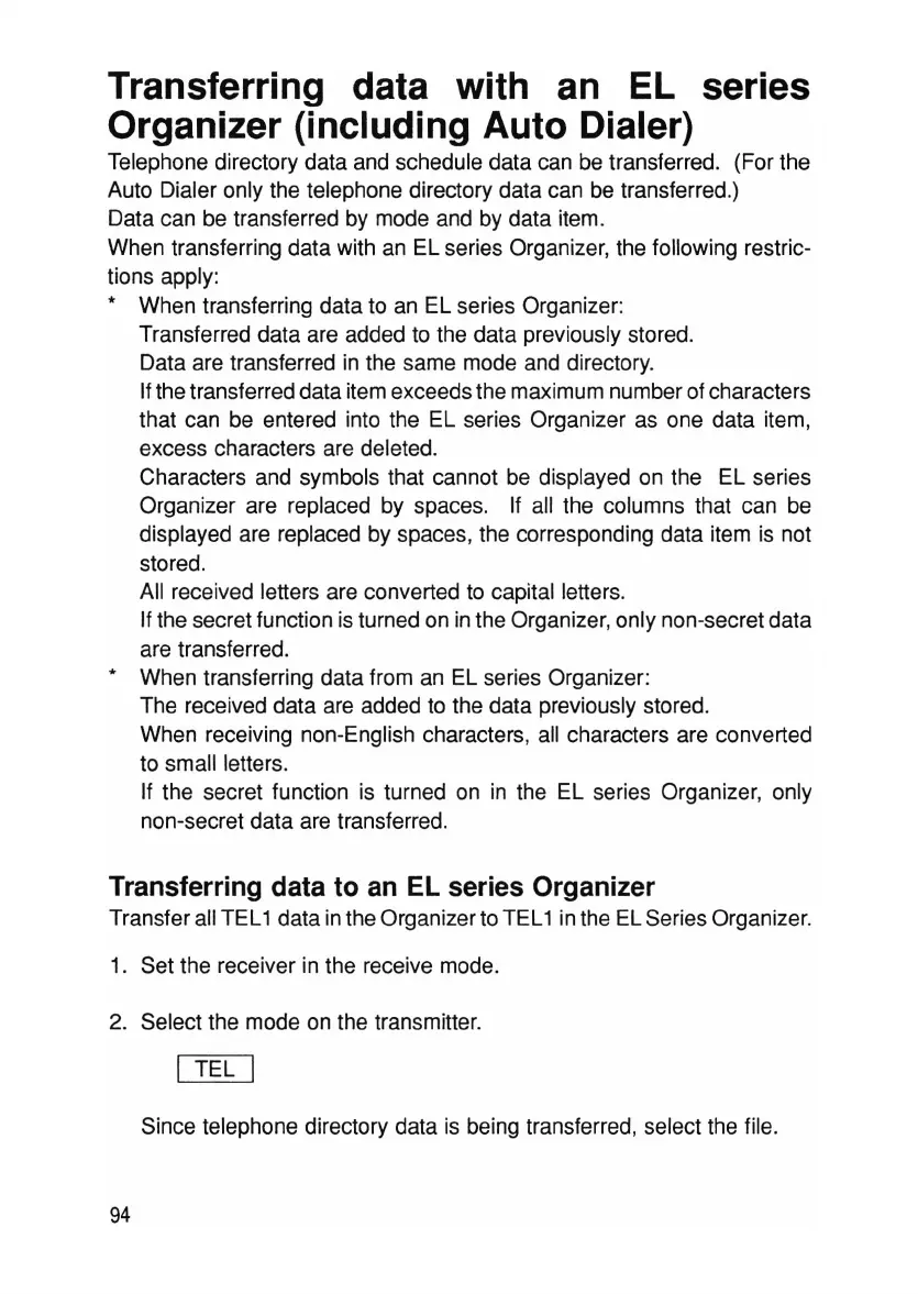 When transferring data with an EL series Organizer, the following restric-