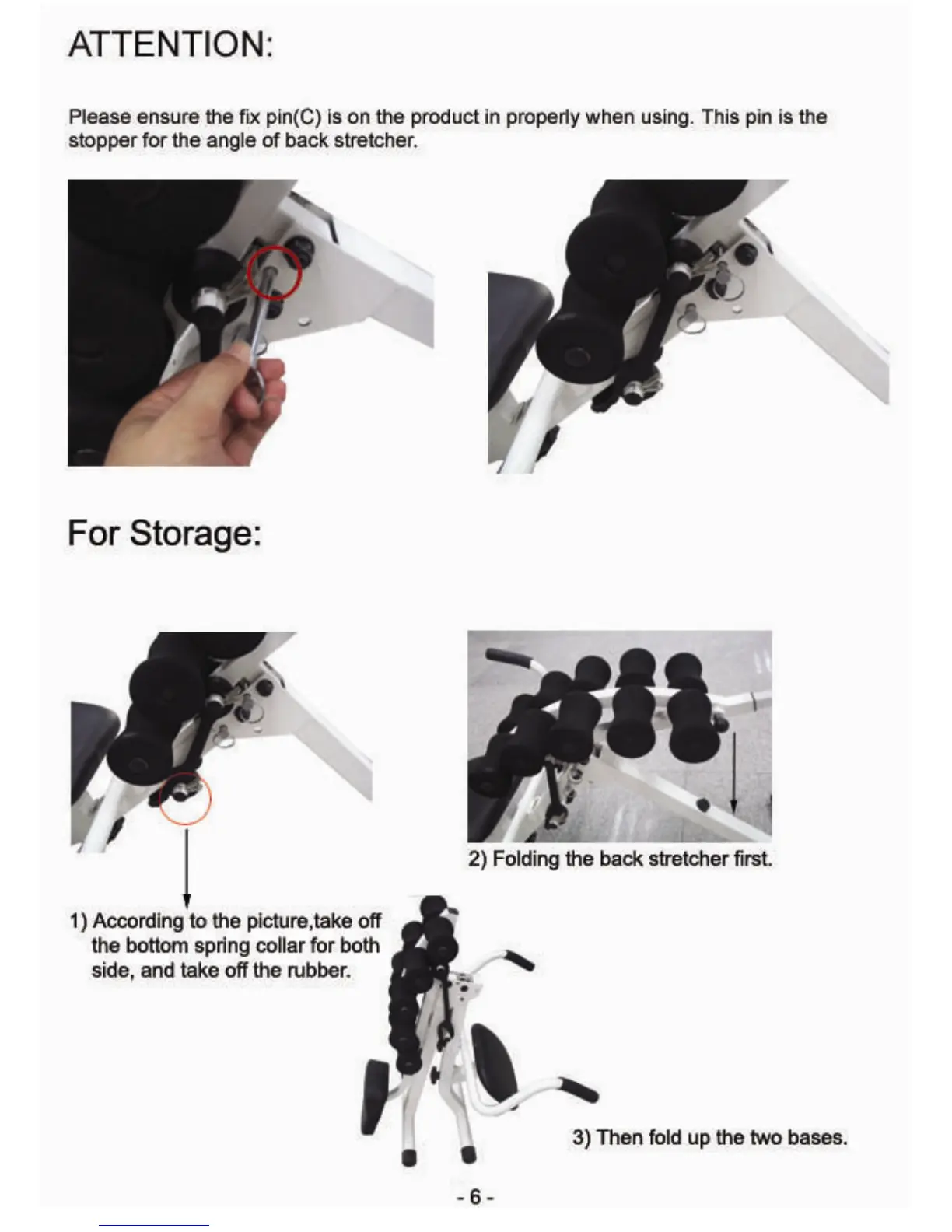 Sharper Image Back Stretcher - Important Usage Note; Fix Pin Placement; Storage Instructions; Folding Procedure