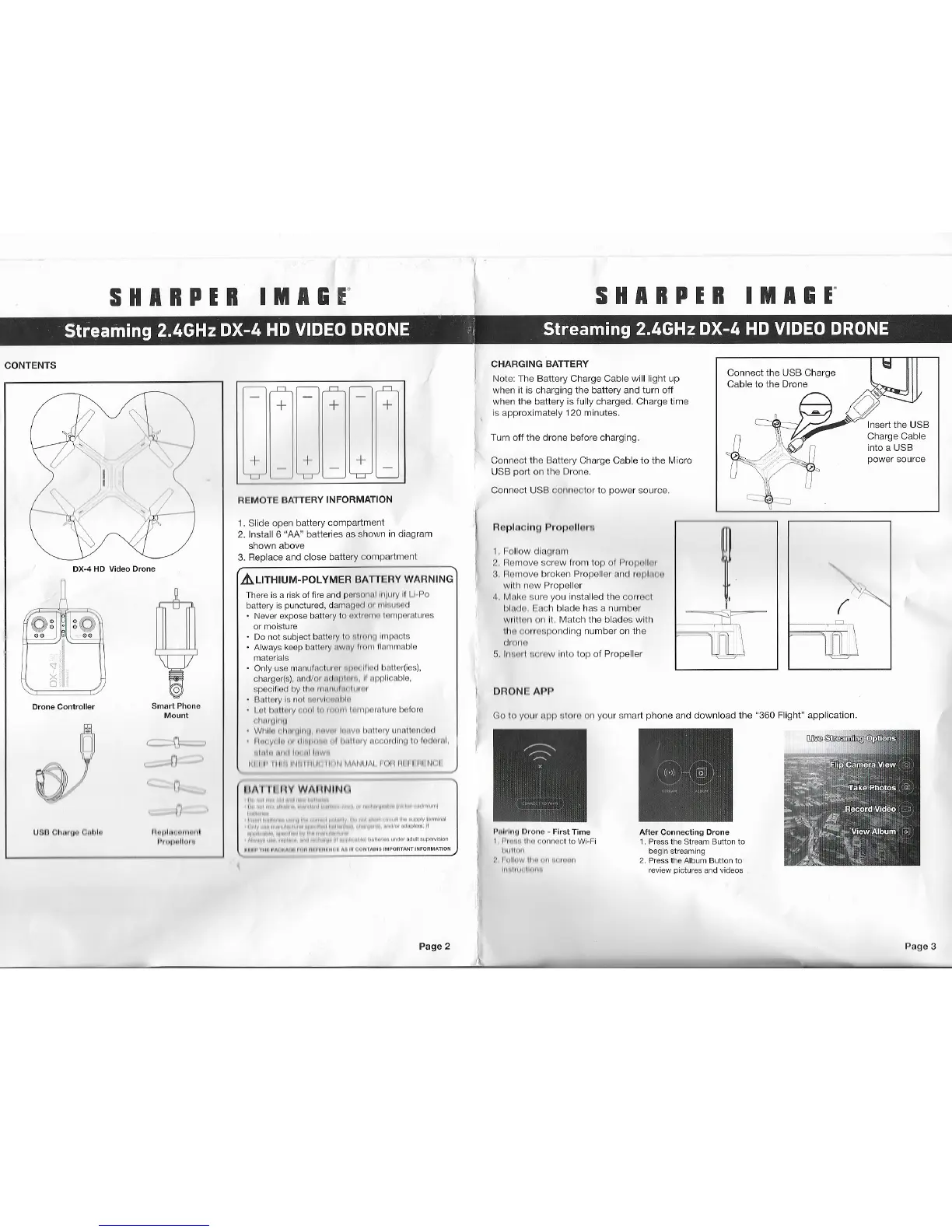 Sharper Image DX-4 - Drone Components and Setup; Remote Battery Installation; Battery Charging Procedure; Connecting to the Drone App