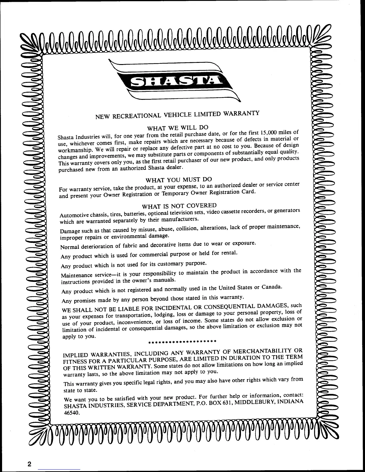 Shasta Class A - RV Warranty Information; Warranty Coverage and Owner Responsibilities