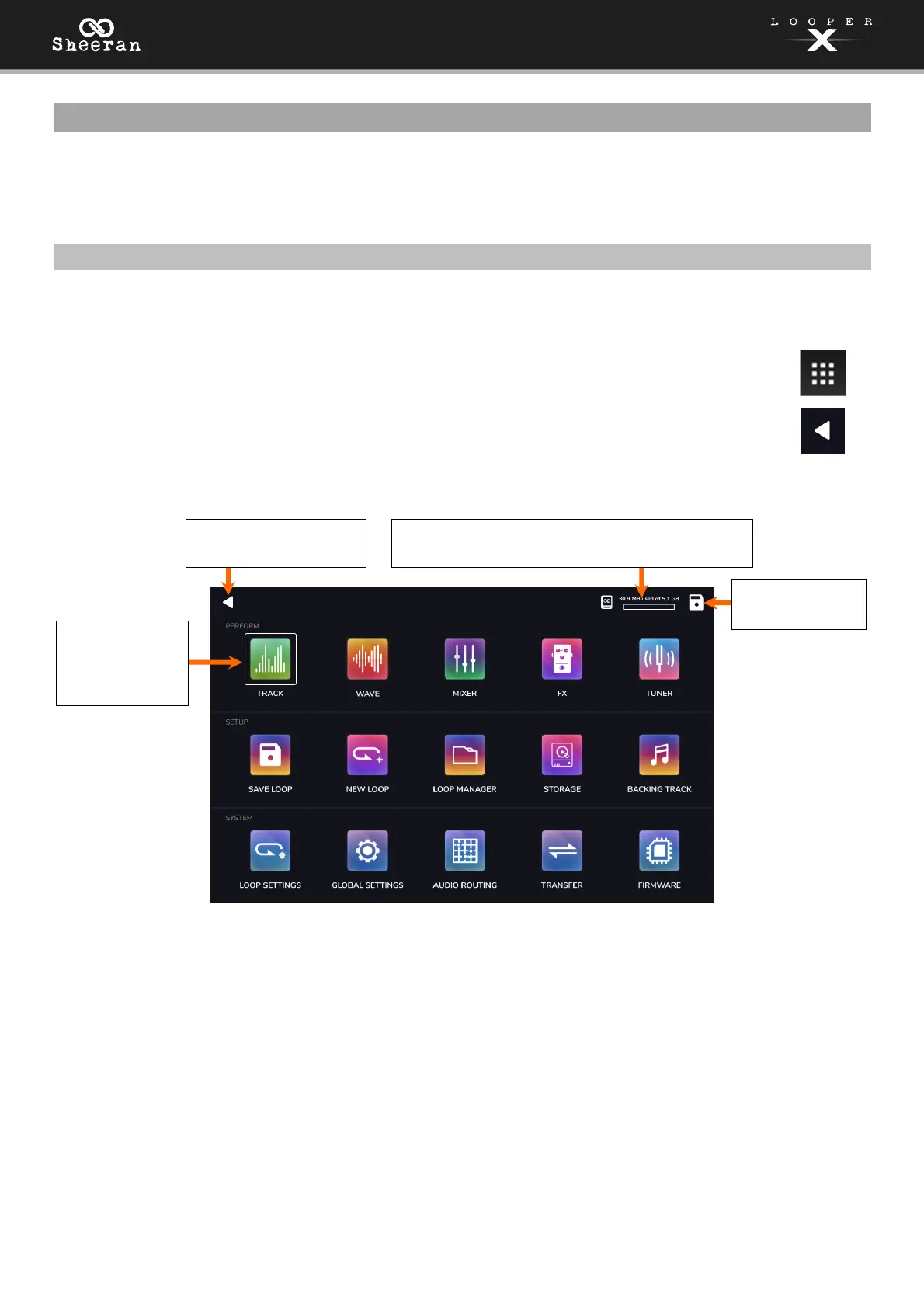 the touchscreen. This menu is used to access the various features of the Sheeran Looper X.