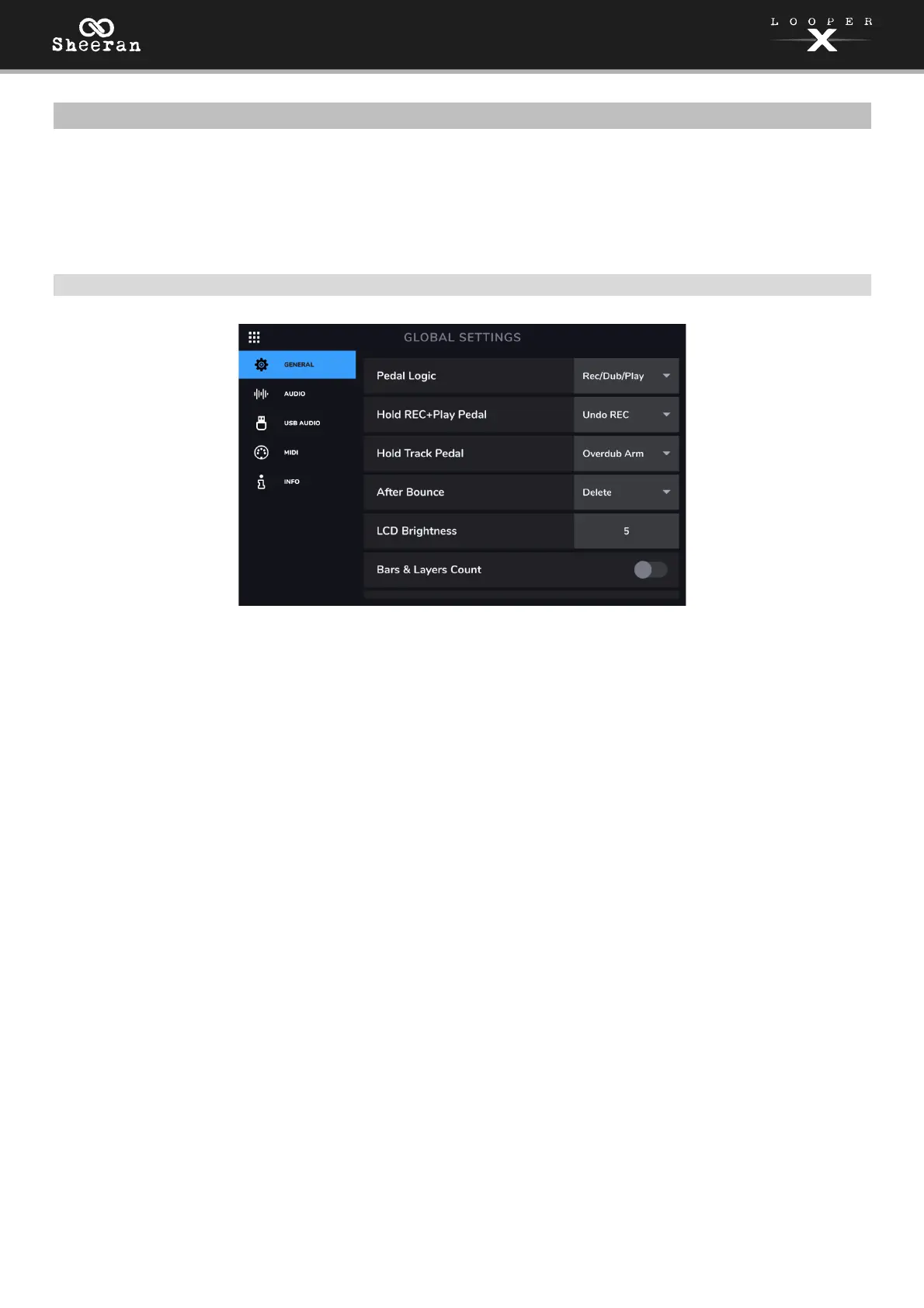 Use the Global Settings page to configure Sheeran Looper X’s overall settings, including settings that affect