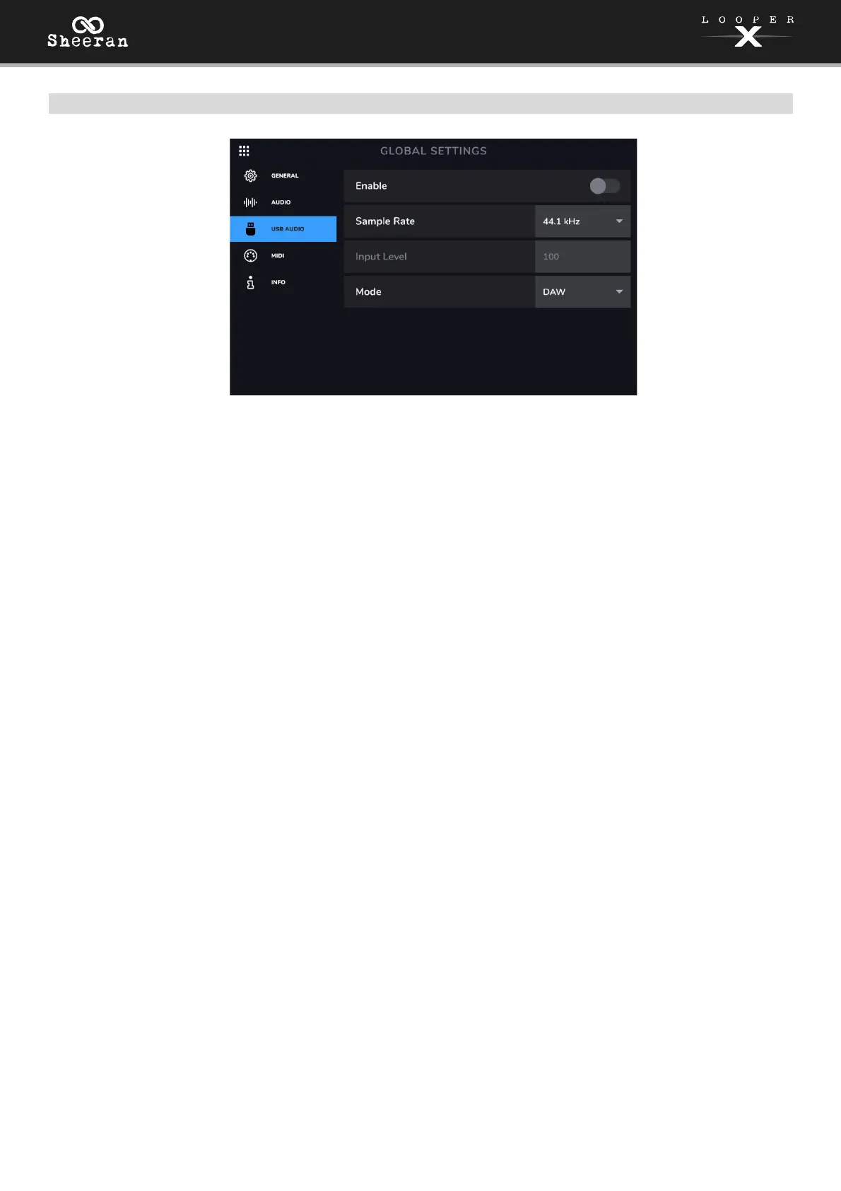 Enable: This setting determines whether or not Sheeran Looper X is sending a USB audio signal over
